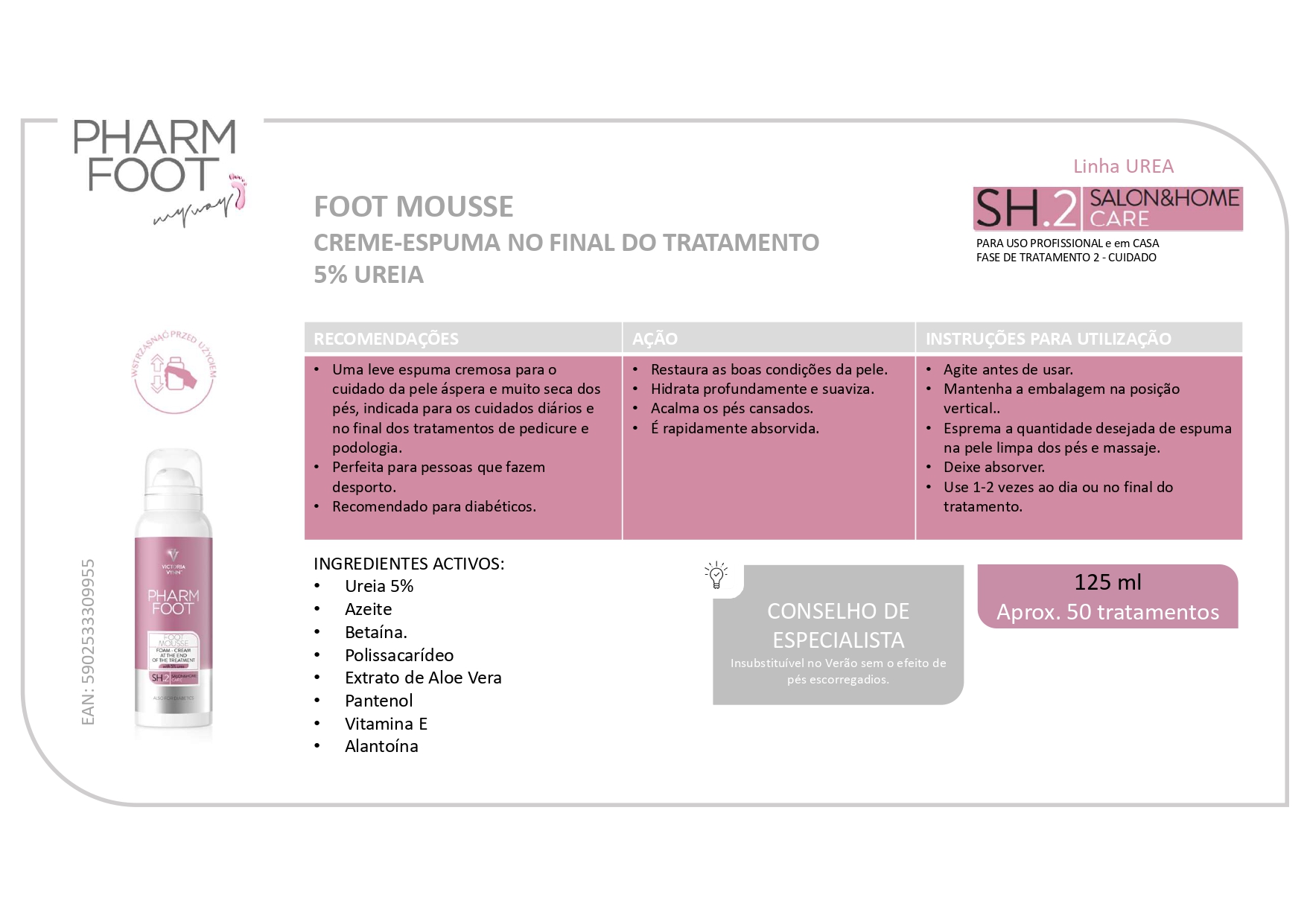 Uma leve espuma cremosa para o cuidado da pele áspera e muito seca dos pés, indicada para uso diário e no final dos tratamentos de pedicure ou podologia.