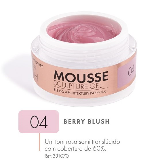 MOUSSE SCULPTURE GEL é um produto que funciona perfeitamente com o pincel, apenas necessita de ser levemente manipulado na direção certa enquanto realiza o trabalho. Após secagem em UV ou LED, torna-se ultra forte, duro e resistente a danos, mas permanece fácil de ser trabalhado. Garante a durabilidade do trabalho.